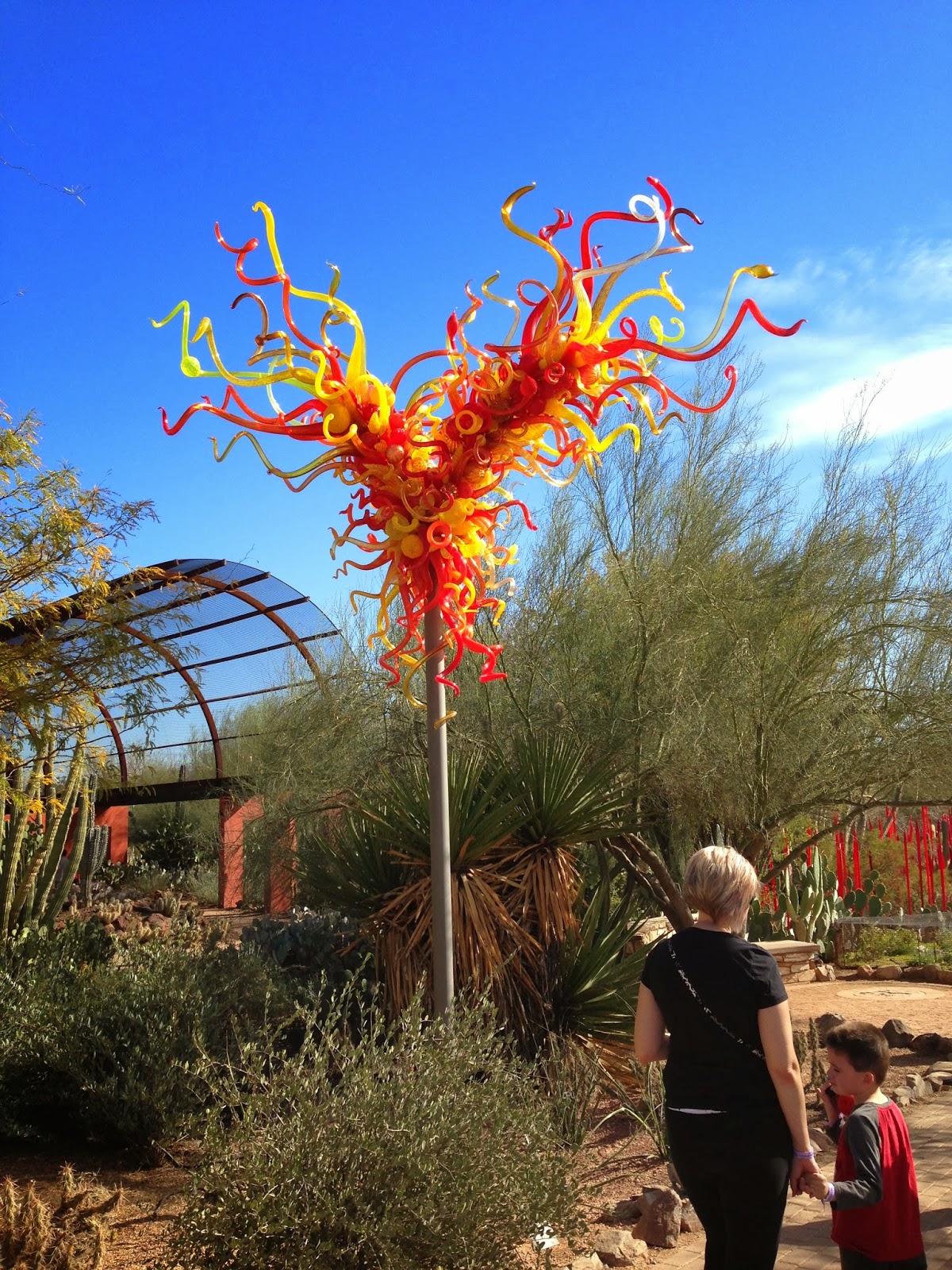 When I discovered he was showing again this year, I knew I had to go and go and go again. When you walk up to the Botanical Gardens, this is the first glimpse you get. Three tall glass art forms that resemble cactus.